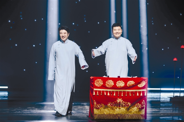 晚会中,金霏、陈曦带来相声作品《万一呢》,诙谐幽默的表演令观众忍俊不禁;高晓攀、尤宪超的《敬您一杯酒》唱响主旋律,敬祖国,敬家乡,敬自己,也敬未来;李菁、盛伟及中央民族大学音乐学院的同学们创新性带来配乐相声《煮酒论英雄》,葛四、郭金杰、何欢、葛九四群口相声《一出好戏》及王春阳、马博瑞的《你别演了》爆梗频出,包袱笑点密集,众多流行元素被演绎得丝滑有趣。