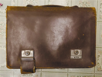 这只公文包体长39厘米,宽27厘米,厚重而挺括,内有六个夹层和两个笔套。“我小时候,它就放在家里的高柜上,父亲非常爱惜,我们小孩子不敢乱动。”孙加祺回忆道。直到1971年父亲去世后,他在整理遗物时,才郑重地打开了这只比自己还年长的皮包。