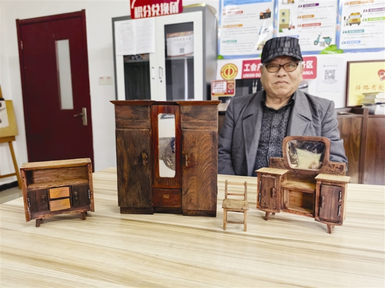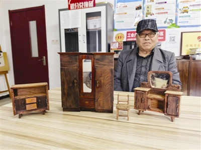 在河东区中山门街道互助西里社区的小广场上,经常能看到一位老人专注地摆弄手中各式各样的微型木工作品——小巧精致的桌椅、玲珑精巧的橱柜、结构复杂的书架。他叫张胜起,一位退休公交车司机,用双手在方寸之间复刻着记忆中的家具。