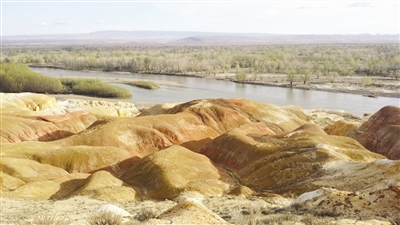 离开天外来客园,顺着人工修建的木栈道前行,便进入五彩滩雅丹景观区。走上观景平台举目观望,额尔齐斯河气象万千、风光旖旎。这是我国唯一一条自东向西流淌、最终汇入北冰洋的河流,河中水流缓缓,波澜不惊。两三个沙洲静卧河床之上,渚上灌木丛丛、绿茵片片,如同绿宝石一样青翠醒目,为河景增添秀色。