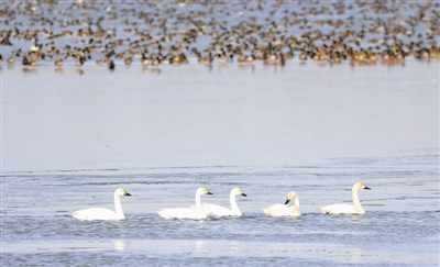 七里海工作人员韩克武常年与鸟类打交道,称得上是一个鸟类专家。他告诉记者,这是七里海首次在这个时节发现小天鹅群体驻留,算是一次意外之喜。