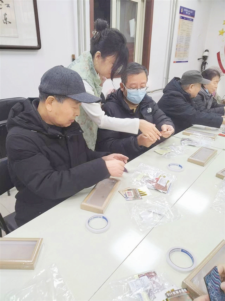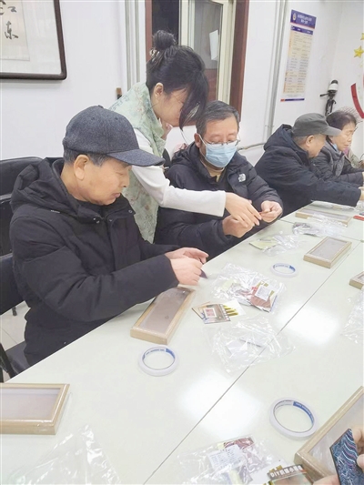 近日,河北区月纬路社区活动室内,十多位居民围坐在长桌前,在社区工作人员的指导下开始动手制作宋锦相框,他们挑选合适的图案和粘贴装饰,固定好布料,将“如意”“喜至”“长乐”“福来”等春节祝福词语裁剪成精致的小卡片,粘贴在相框内部锦帛处,营造出喜庆祥和的视觉效果。