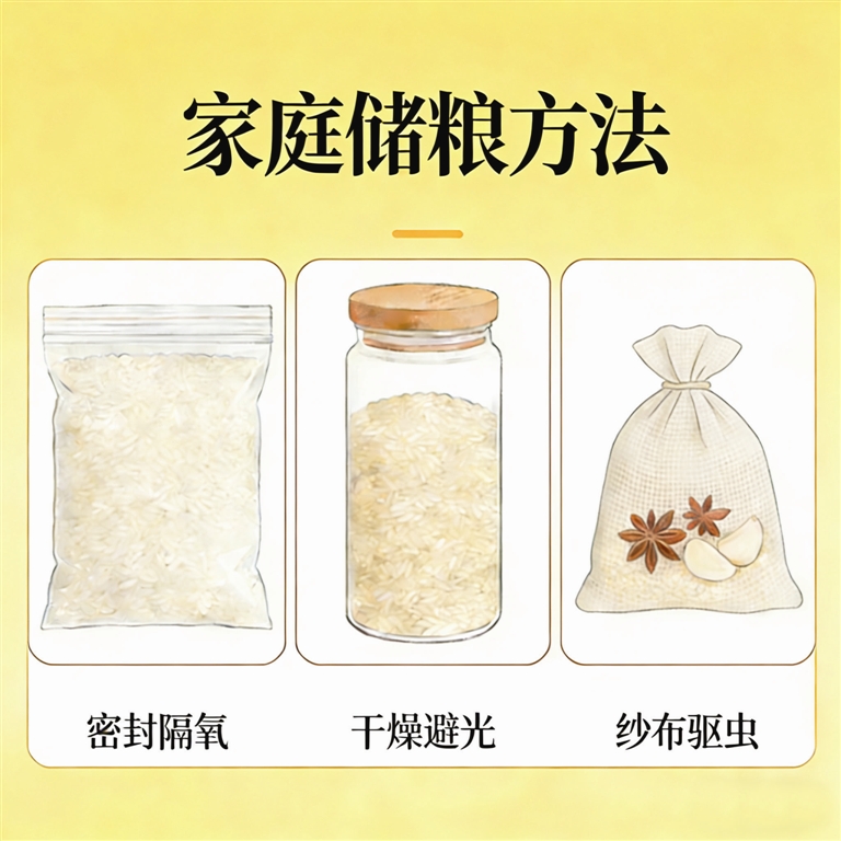 国家粮食和物资储备局安全仓储与科技司发布的《2021年全国粮食和物资储备科技活动周科普宣传册》建议,家庭储粮应选择避光、通风、阴凉、干燥的环境。可采用缺氧防虫法,如使用真空袋密封,或将大米装入洁净的瓶子中并拧紧瓶盖,以隔绝氧气。此外,放入装有花椒、八角、大蒜等天然驱虫材料的纱布包,也能起到防虫效果。