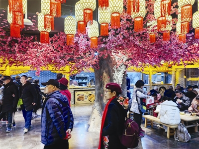 进入“千城宴”,很多游客瞬间被眼前的景象所吸引,一层“四街两道一河一世界”的设计布局巧妙,百余个美食档口错落有致,从天津本地的煎饼馃子、麻花、炸糕,到全国各地的特色小吃均四溢着香气。“我是专门从市区过来的,听说这里汇集了全国各地的小吃,一定要尝尝!”手里拿着煎饼馃子的李女士笑着说道,她身后,排队购买炸糕的队伍已蜿蜒十余米。二层五个主题文化小院同样热闹,以文化发展脉络为线索,小院融合时间演进、时代特征与八种文化形态,构建出从历史到未来的叙事逻辑。