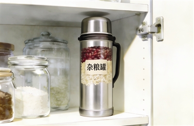 杂粮、干货最怕受潮生虫。旧保温杯自带强大密封性,拧紧盖子就是天然防潮箱。贴上标签后透明可视、取用方便,比塑料袋实用得多。