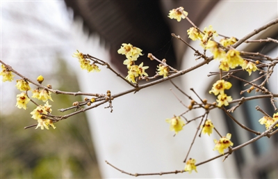 近日的水上公园盆景园,吸引了大批游客,因为园内的几十株蜡梅正在盛放,黄色的花瓣让人忍不住驻足拍照。走进盆景园内,循着人流最多的地方,便能见到一株株遒劲枝条上的黄色花朵,阵阵花香袭人。仔细观看花朵,可以发现黄色花瓣仿佛带着天然油蜡,里面包含着粉紫色花蕊。景观管理中心负责人告诉记者,受春节气温偏高影响,蜡梅较往年提前两个节气绽放,这段时间正处于盛放期,每天都有大量游客来此赏花。据该负责人介绍,1990年水上公园建立盆景园时,就移植了两株蜡梅,蜡梅在天津属于稀有花种,因为得到游客喜爱,最近几年又陆续栽种了30多株。