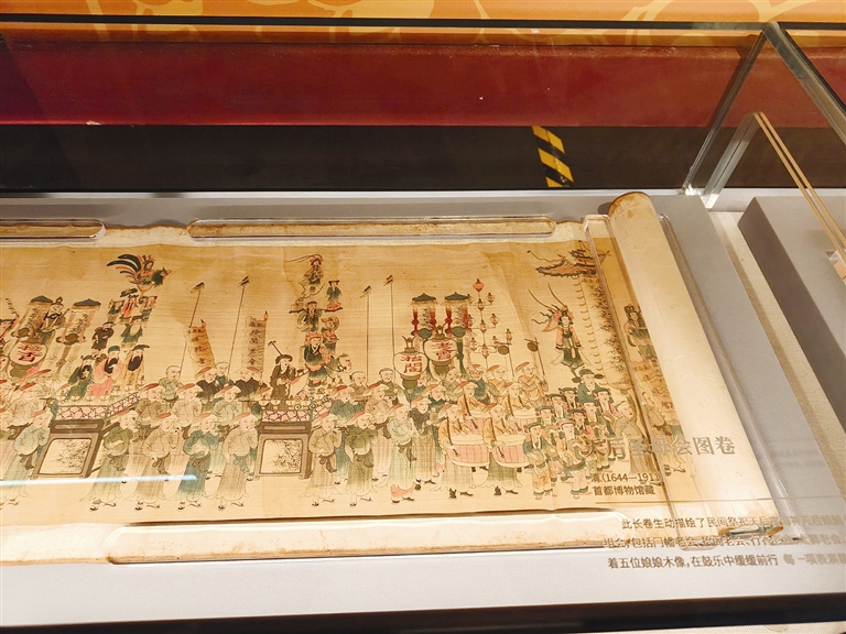“我们带着这些展品在首博布展时,我一眼就看到了这幅首博馆藏的《天后圣母会图卷》。”丁袁磊对天津天后宫、皇会有着多年深入研究,眼前这幅图中的行会盛景,从内容乃至画风上来说,都非常眼熟。
