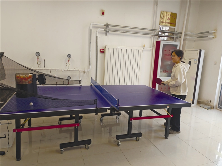 不仅是青少年,活动室里同样活跃着银发族的身影。居民张悦华利落地挥拍,稳稳接住发球机送来的球,动作流畅。“不用等人凑伴儿,自己一个人就能练球,活动活动腿脚,对身体特别好。”旁边,刚练完一组的张树维用毛巾擦了擦额头的汗,连连点头:“以前打球总得‘预约’搭档,时间不好凑。这回好了,想什么时候来都行,在家门口就能享受专业设备,太方便啦!”