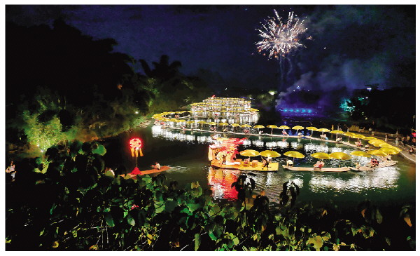 10月3日,遇龙河接待游客达47259人次,较去年同期增长79%,成为国庆热门景区之一。图为游客乘坐遇龙河金龙巡游竹筏。 唐一平 摄