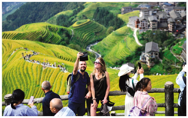 10月3日,游客在龙胜各族自治县龙脊梯田景区观光游览。时下,龙脊梯田景区种植的水稻进入成熟期,层层叠叠的梯田被金灿灿的颜色浸染,呈现出一幅“大地铺金”的金秋景象,蔚为壮观,吸引众多中外游客前来观光游览,畅享假日时光。