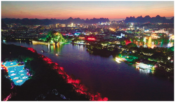▲10月4日晚,一抹亮丽的晚霞映亮天际,漓江两岸的霓虹灯和晚霞一同“点亮”假日里桂林的浪漫夜。