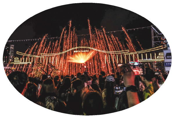 ▲10月3日晚,甲天下广场,市民游客在欣赏漓泉啤酒音乐节烟花晚会。 周斌 摄