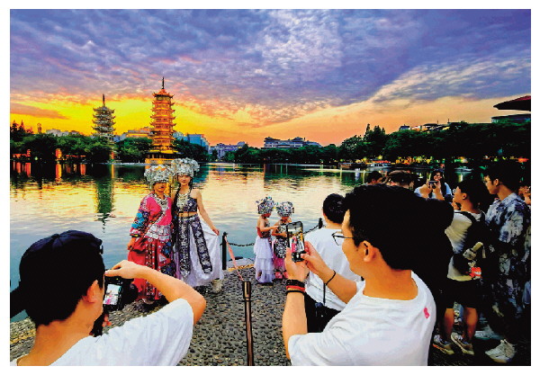 国庆假期,游客在彩霞满天的两江四湖景区拍照留影。 李腾钊 摄