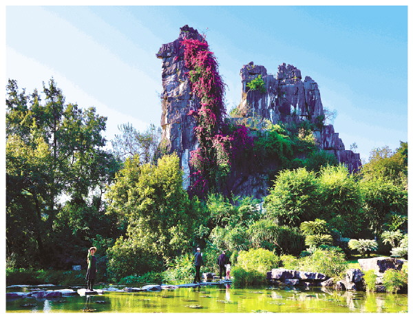 ▲11月1日下午,秋日的暖阳洒在七星公园的骆驼山上,骆驼山一丛开得正艳的三角梅花瀑从山顶倾泻而下,蔚为壮观,把骆驼山装扮得格外美丽,引得众多市民、游客前来拍照。 记者李凯 摄