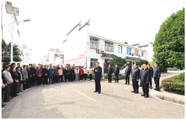 11月4日至6日,中共中央总书记、国家主席、中央军委主席习近平在湖北考察。这是5日上午,习近平在咸宁市嘉鱼县潘家湾镇四邑村考察时,同村民们亲切交流。 新华社记者谢环驰 摄