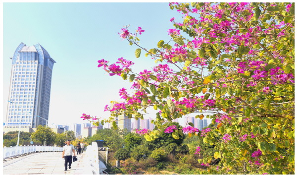 近段时间,桂林市区各处的红花羊蹄甲盛开。在中隐路、锦绣路、市民公园等城市主干道旁和公园里,粉紫色的花朵挂满枝头,把桂林的秋天装扮得胜似春天一般美丽动人。