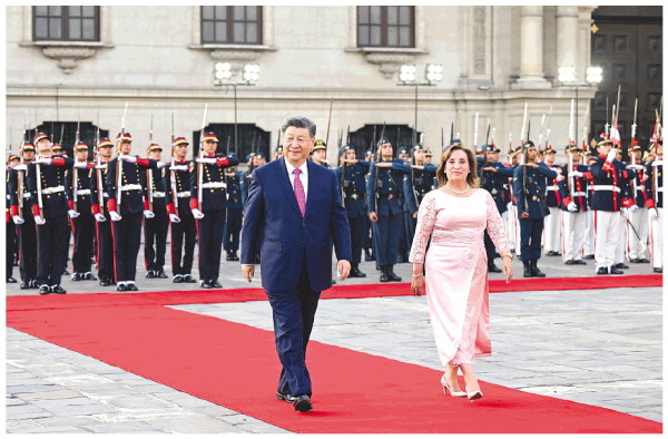 习近平指出,这是我第三次访问秘鲁,也是一年时间里第三次同总统女士会晤。许多秘鲁民众自发聚集道路两旁,挥手致意表示欢迎,让我深切感受到秘鲁人民对中国人民的友好情谊。中秘同为文明古国。古老文明的深厚积淀,赋予中秘两国智慧和胸怀,让我们能够看清历史前进方向,顺应时代发展潮流,始终坚持平等相待、互尊互信、互学互鉴,成为不同体量、不同制度、不同文化国家团结合作的典范。建交53年来,特别是我2016年对秘鲁进行首次国事访问以来,在双方共同努力下,中秘贸易投资合作快速增长,为两国人民带来实实在在的利益。双方要总结经验,推动两国务实合作提质升级,使中秘全面战略伙伴关系不断迈上新台阶,更好造福两国人民。