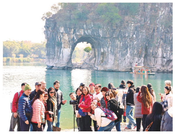 2025年1月1日,我市暖阳高照,来自各地的游客纷纷来到城徽象鼻山前拍照,“打卡”美丽的桂林山水,迎接新的一年的到来。记者李凯 摄