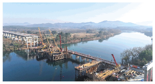 1月14日,记者在全灌高速公路项目湘江特大桥建设现场看到,塔吊林立、机声隆隆、车来车往,建设者顶着寒潮,争分夺秒、昼夜不停、干劲“满格”地对14、15、16、17号桥墩紧张施工。