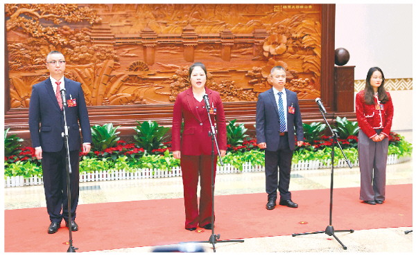 桂林市代表团姜曙霞代表(左二)亮相代表通道接受采访。 记者 李凯 摄