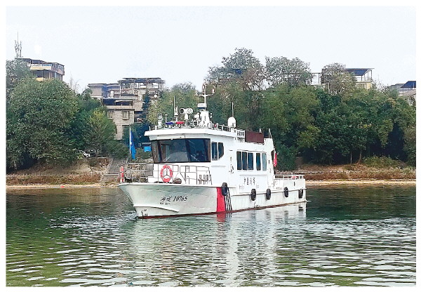 ▲广西首艘纯电池动力直翼推进公务巡逻船——“海巡10765”正在漓江上进行航行试验。 (桂林船舶检验中心供图)