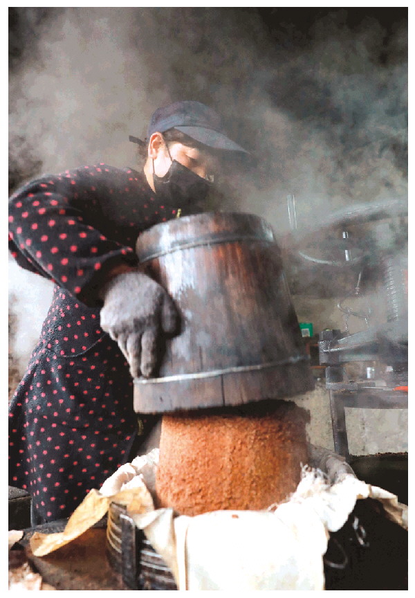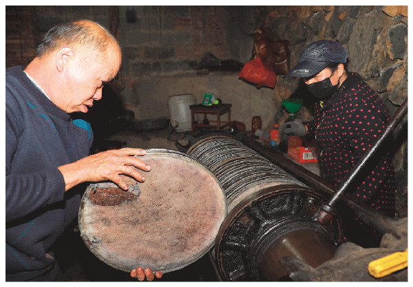 工人将蒸熟的茶籽粉填入圆形的铁箍之中,做成胚饼。