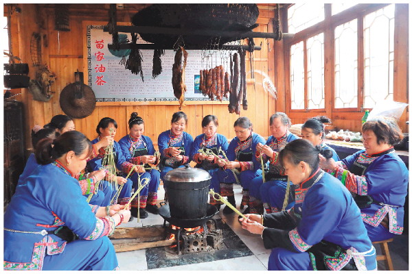 “劳动一下午,不喝碗油茶说不过去。”杨芬说着来到炉边打起了油茶。将油、盐、生姜、茶叶倒入锅内同炒,待油冒烟,加入少许清水煮沸,用木槌将茶舂碎,再添水用文火煮。另一位阿嫂则在碗中一一添加玉米、花生、米花、粑粑果,等茶水煮好,往碗里舀茶。沸茶一冲,茶香味、米香味齐齐涌了出来。黄茶、绿葱、白米、红果,小小的茶碗里,五彩聚齐。喝一口茶,心悦神怡。