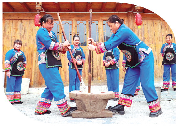 阿嫂们围在一起打糍粑。