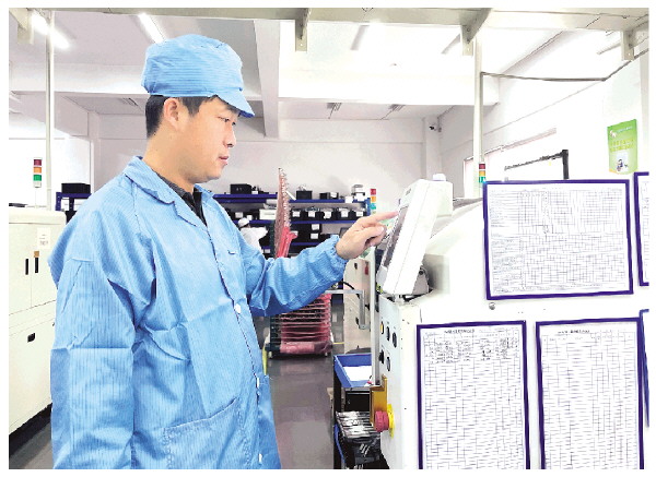 海威科技工作人员在SMT贴片线上操作设备,设备则自动完成相关产品的生产。