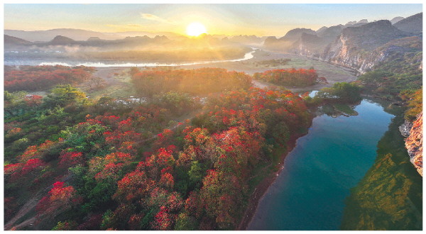 每年秋冬季,乌桕滩上的乌桕树叶由绿转黄,再由黄转红,宛若一幅诗意盎然的水墨画。记者唐艳兰 摄