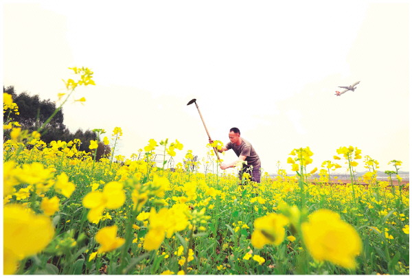 3月3日,在临桂区两江镇空港油菜花田中,当地群众正在翻地,两江国际机场起飞的一架飞机恰好掠过,农户、油菜花和飞机相映成趣,形成别具一格的“春耕图”。