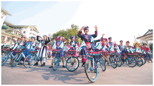 3月22日,我市举办第二场“广西三月三”预热快闪活动。当天身穿各民族服装的山歌爱好者、山歌传唱人和青年学生一起在七星公园、漓江畔、正阳步行街等地点以徒步和骑行的方式向广大市民和游客倡议三月三环保出行,深度体验城市之美,嗨唱山歌更嘹亮。图为青年学生和山歌传唱人在七星公园门口向游客展示民族风情、倡导绿色出行。