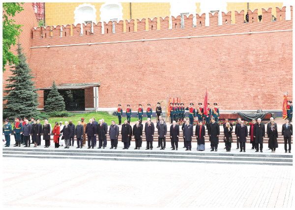 庆典结束后,习近平同其他国家领导人一起从红场来到亚历山大花园,向无名烈士墓献花,并肃立默哀。随后,各国领导人集体合影留念。