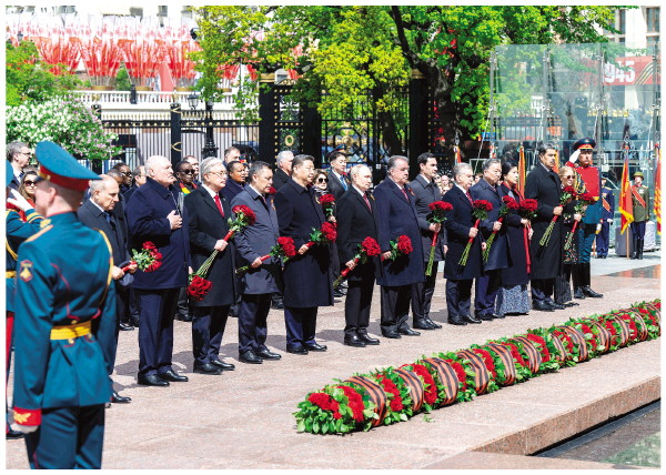 ▲当地时间5月9日,俄罗斯举行盛大庆典,纪念苏联伟大卫国战争胜利80周年。国家主席习近平和来自世界20多个国家及国际组织领导人应邀出席庆典。庆典结束后,习近平同其他国家领导人一起从红场来到亚历山大花园,向无名烈士墓献花,并肃立默哀。 新华社记者翟健岚 摄