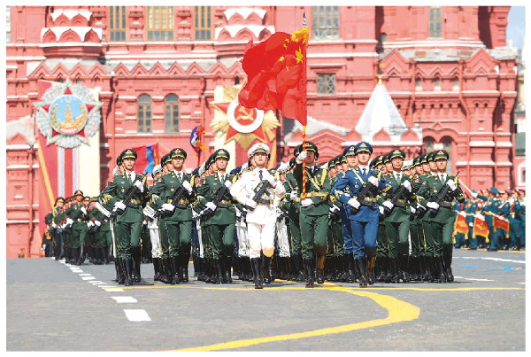 ◤5月9日,在俄罗斯首都莫斯科,中国人民解放军三军仪仗队方队参加纪念苏联伟大卫国战争胜利80周年阅兵式。