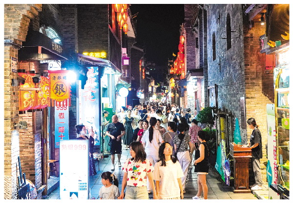 ▲随着暑假到来,桂林各景区景点亲子团、学生团明显增多。尤其像靖江王城、东西巷历史文化街区等兼具历史人文和吃喝玩乐等网红元素的景区更是深受亲子团和学生团体的追捧。图为7月4日晚,东西巷历史文化街区迎来大批游客,带孩子的家庭和青年学生随处可见。 记者何平江 摄