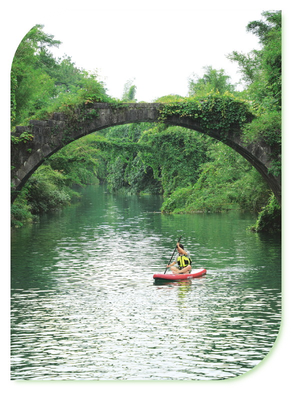 图④:划着桨板探寻不一样的风景也是当代年轻人喜欢的旅行方式。图为游客在遇龙河上游玩桨板。