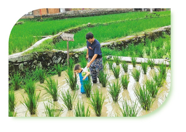 图⑥:当代不少年轻父母喜欢带着孩子体验农耕生活。图为家长带着孩子在龙脊梯田体验抓鱼。 来源于社交平台