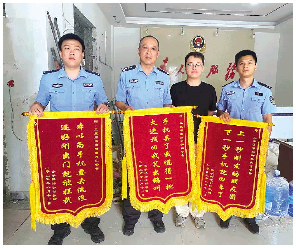 本报讯(记者陈静 通讯员黄维)“本以为手机要去流浪,还好刚出门就被拦截。”“手机丢了我慌得一批,火速找回我笑出鹅叫。”“上一秒刚发的朋友圈,下一秒手机就回来了。”……近日,桂林市公安局三里店派出所迎来了一位特殊的访客。市民付先生一人携三面写有幽默话语的锦旗,高调致谢警长周先文、民警常伟和辅警杨杰淳。锦旗上的文字不是正经严肃的感谢词,而是各种幽默的网络语言,让人忍俊不禁。