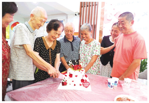 社区几对金婚银婚夫妻一起切七夕蛋糕。