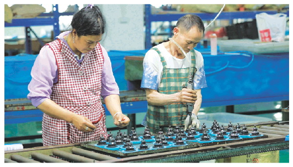 工业园区内企业车间工人在紧张忙碌着。