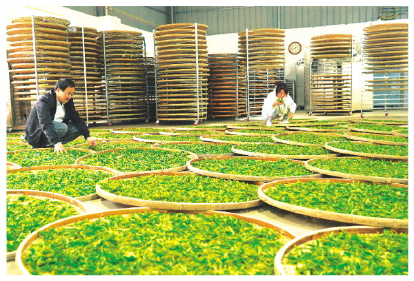 工人在晾晒茶叶,为油茶加工做准备。