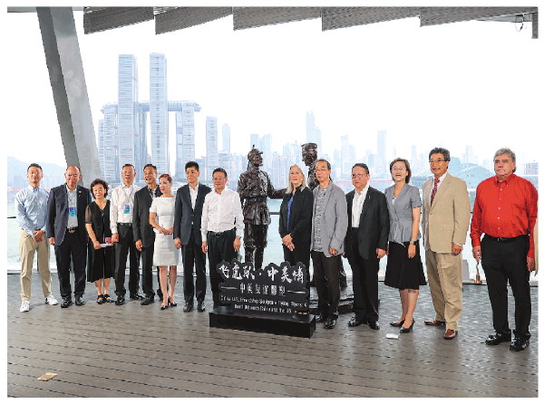 8月30日,在重庆国际会客厅,飞虎队陈纳德将军的孙女帕蒂·卢·陈纳德·史密斯(右六)等嘉宾在雕塑揭幕后合影。 新华社记者陈诚 摄