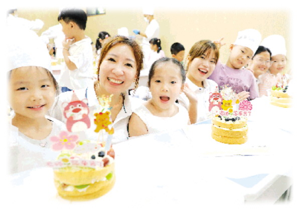 活动现场,孩子们系着小围裙,戴上厨师帽,在家长志愿者的指导下,打奶油、抹坯、裱花、装饰,每一个步骤都做得一丝不苟。有的孩子在蛋糕上写下祝福语,有的用水果拼出爱心图案,还有的别出心裁地制作了课本形状的饼干装饰。“我要给李老师做一朵粉色奶油花!”三年级同学小雨小心翼翼地握着裱花袋,在她灵巧的小手下,一朵略显稚嫩却充满心意的粉色玫瑰在蛋糕上缓缓“绽放”。