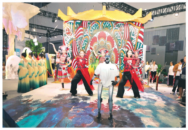在中国—东盟博览会旅游展区,智能机器人与舞者同台亮相。 记者李凯 摄