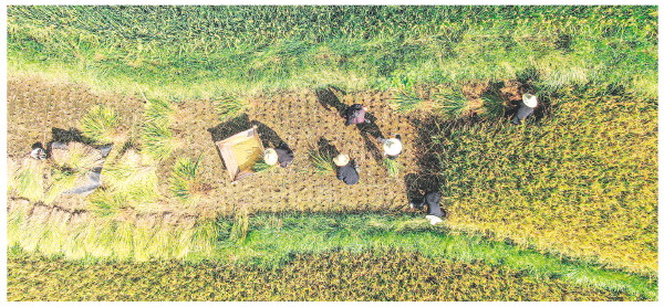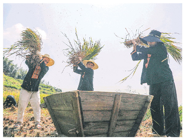 ▲村民采用传统方式让稻米脱粒。 阳海翔 摄