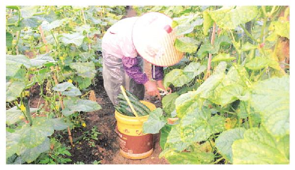 农户在采收大棚青瓜。