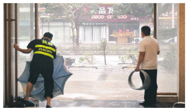 9月24日,广东阳江市江城区横一路一家酒店的工作人员在门口值守。 新华社记者邓华 摄