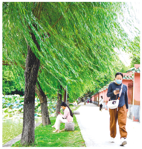 ▲近日,几场秋雨后,桂林天气渐渐转凉,昼夜温差加大,草木开始泛黄,山林换上新的秋装,早出的人们也已穿上了外套,迎接新一轮秋季光景的到来。图为西山公园西湖边的柳树叶子开始泛黄,游人也穿上了外套。 记者何平江 摄