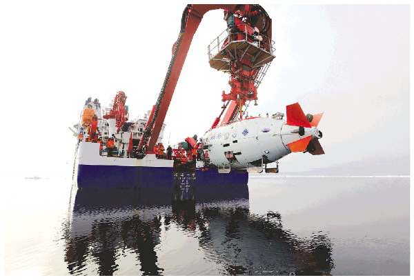 ◤“蛟龙”号离开母船“深海一号”,准备入水下潜(8月6日摄)。 新华社记者刘诗平 摄